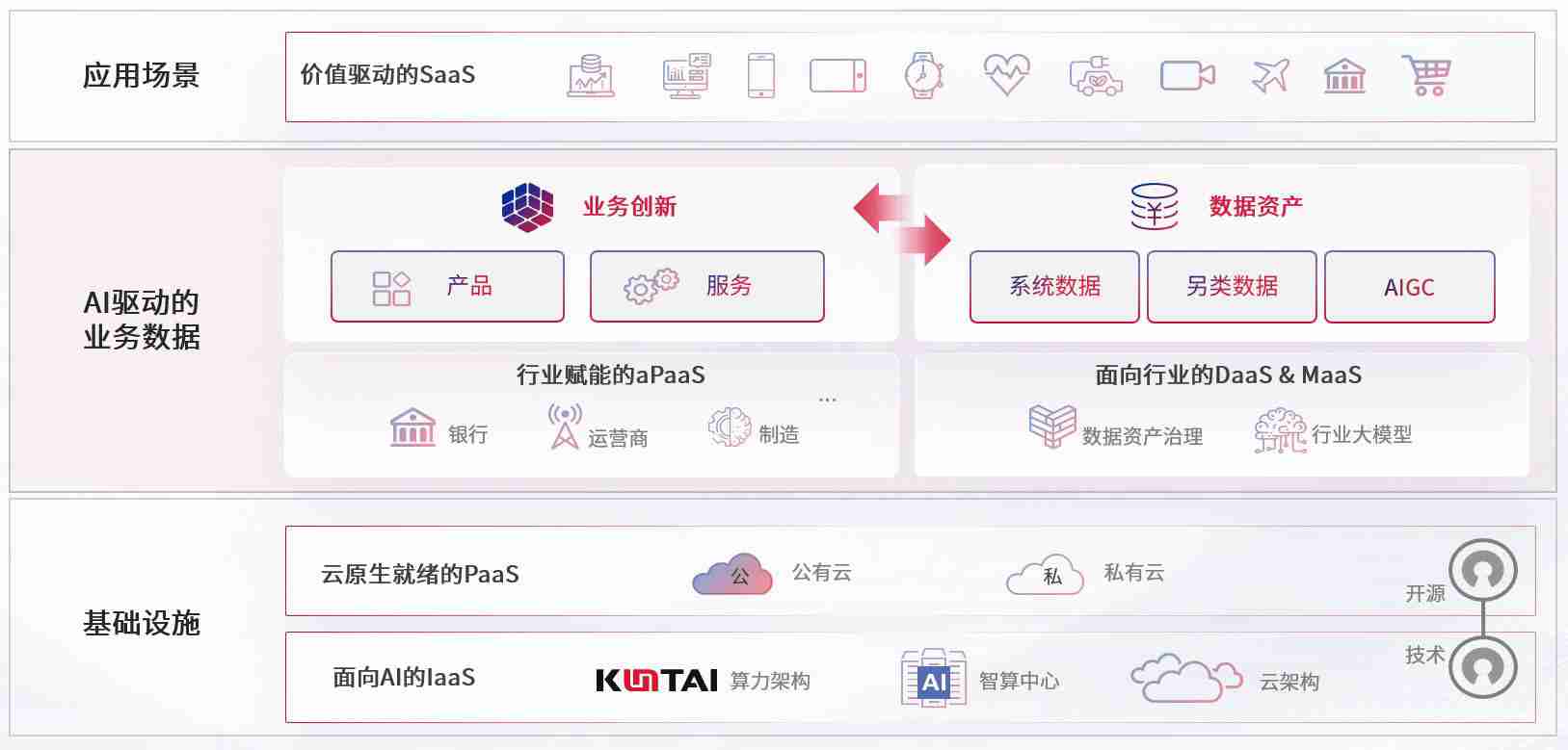 数字时代,,,,围绕企业数字化转型的关键要素,,,,PA尊龙凯时数码开创性的提出数云融合战略和技术体系框架,,着力在云原生、、数字原生、、AI原生和信创产业上架构产品和服务能力,,为处在不同数字化转型阶段的快消零售、、、汽车、、、、金融、、、、医疗、、、、政企、、教育、、运营商等行业客户提供泛在的敏捷IT能力和融合的数据驱动能力,,构建跨界融合创新的数字业务场景和新业务模式,,助力企业级客户建立面向未来的核心能力和竞争优势,,全面推动社会的数字化、、、、智能化转型升级。。。